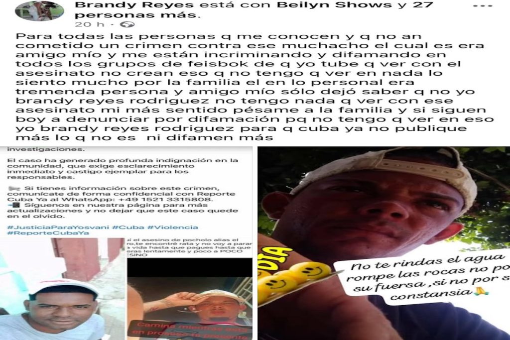 En las últimas horas, uno de los nombres señalados en publicaciones de familiares y allegados, Brandy Reyes Rodríguez, ofreció una declaración pública negando cualquier relación con el crimen. En su mensaje, manifestó que Yosvani era su amigo, expresó condolencias a la familia y advirtió que podría emprender acciones legales si las acusaciones persisten: