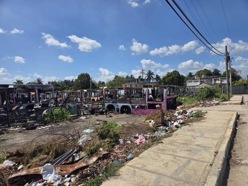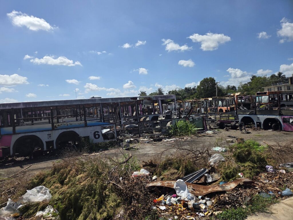 En la fotografía se observan estructuras metálicas reducidas a esqueletos, sin cristales, asientos ni componentes funcionales. Varias unidades presentan signos de haber sido consumidas por incendios, mientras otras parecen haber sido desmanteladas progresivamente. El entorno, rodeado de basura, maleza y escombros, refuerza la sensación de abandono institucional.