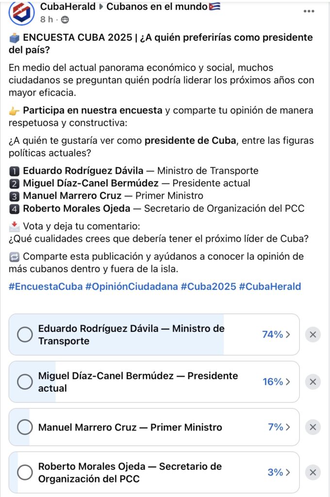 La encuesta, difundida en grupos como Cubanos en el Mundo y CubaHerald Noticias, tuvo un alto nivel de interacción y comentarios de cubanos residentes tanto en el país como en el exterior, que destacaron la necesidad de un liderazgo “más técnico y eficiente” en el contexto actual.