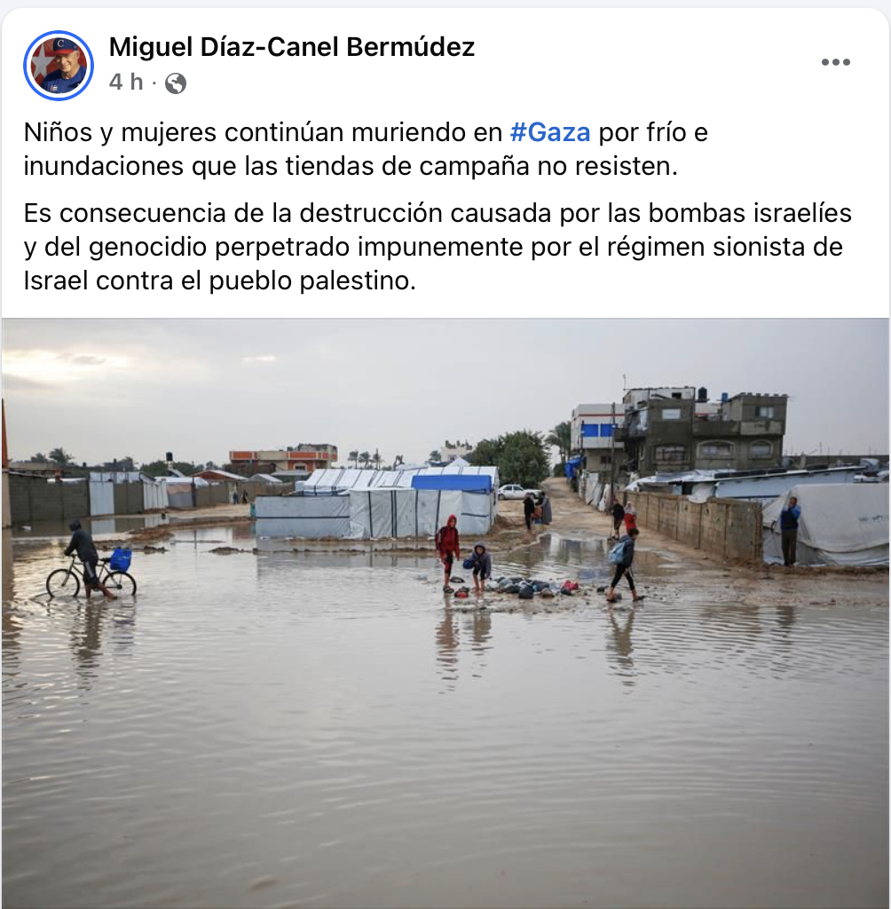 El presidente cubano Miguel Díaz-Canel Bermúdez publicó este lunes en sus redes sociales un mensaje de apoyo a los niños y mujeres afectados en Gaza, aludiendo a las muertes provocadas por el frío, las inundaciones y la incapacidad de las tiendas de campaña para resistir las condiciones climáticas adversas. En su publicación, el mandatario responsabilizó a las bombas israelíes y a lo que calificó como un “genocidio perpetrado por el régimen sionista de Israel” sobre el pueblo palestino.