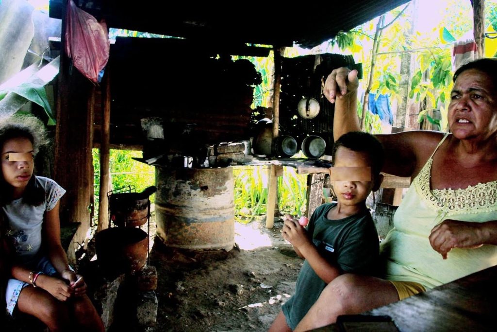 Otra fotografía muestra a una abuela junto a dos niños en una cocina levantada con materiales reciclados, donde lo poco que hay cuelga de paredes corroídas. La imagen transmite la rutina diaria de sobrevivir con lo mínimo, en un contexto donde el abandono estatal se hace cada vez más visible.