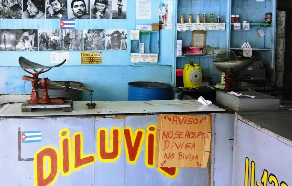 La primera imagen muestra una bodega con paredes decoradas con imágenes de figuras revolucionarias y un cartel que reza «Aviso: No se acepta divisa», destacando la exclusión de monedas extranjeras en un intento de sostener una economía local fuertemente golpeada. La báscula antigua y el entorno austero subrayan la falta de modernización y recursos tecnológicos.