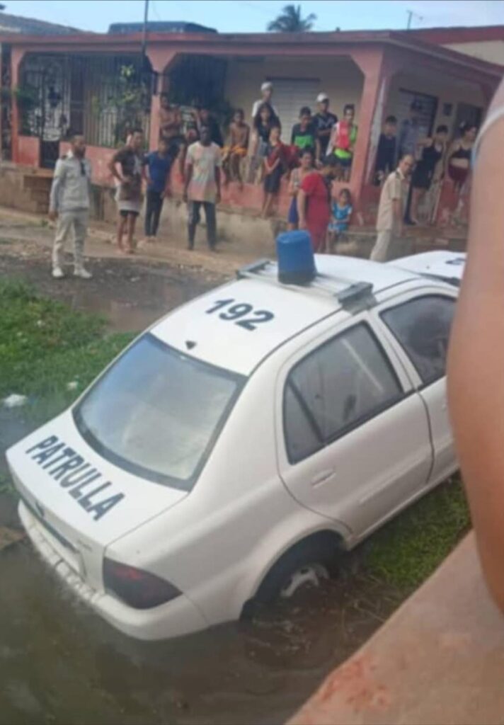 Una patrulla de la Policía Nacional terminó parcialmente hundida en una zanja en una zona residencial de Mayabeque, según muestran imágenes difundidas este sábado. El hecho, del que aún no existen detalles oficiales, habría ocurrido en horas recientes ante la mirada de varios residentes del lugar.