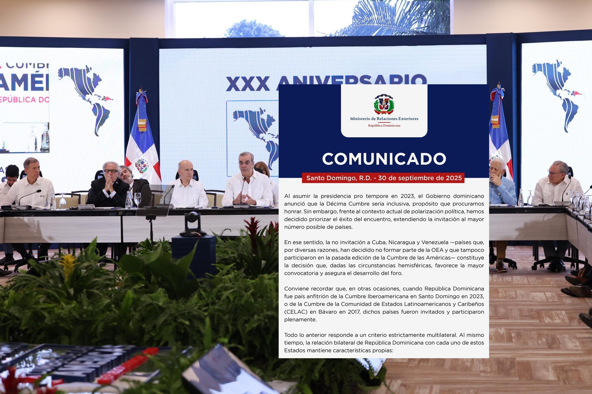 El Ministerio de Relaciones Exteriores de la República Dominicana (MIREX), en su rol de Presidencia Pro Tempore de la X Cumbre de las Américas, anunció que no se cursarán invitaciones a Cuba, Nicaragua y Venezuela para participar en el encuentro previsto en Santo Domingo en diciembre de 2025.